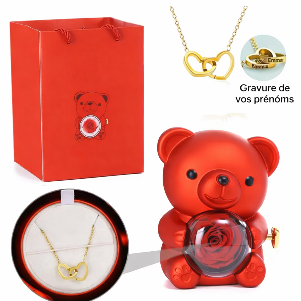 Ours à Rose Éternelle & Collier Personnalisé